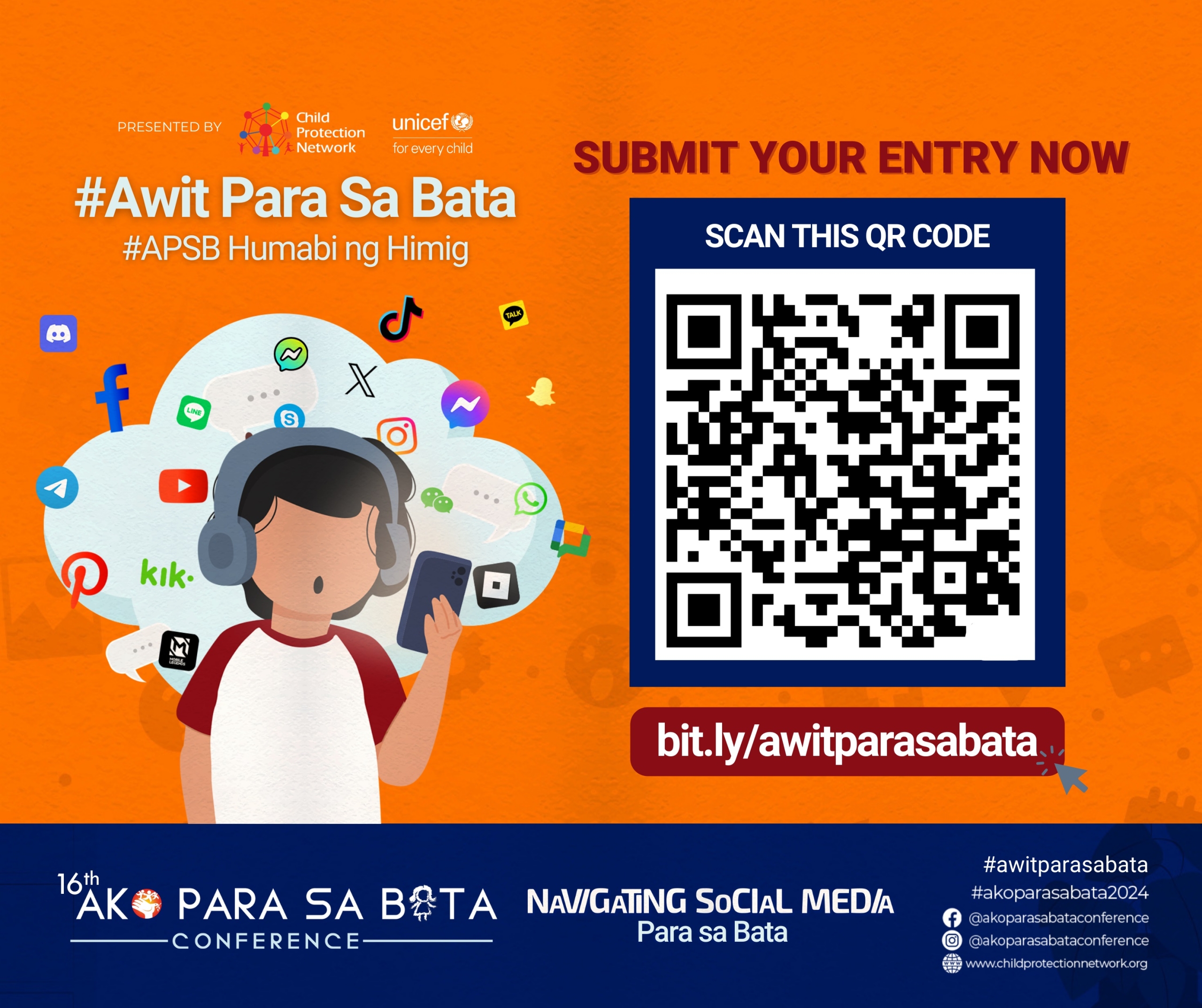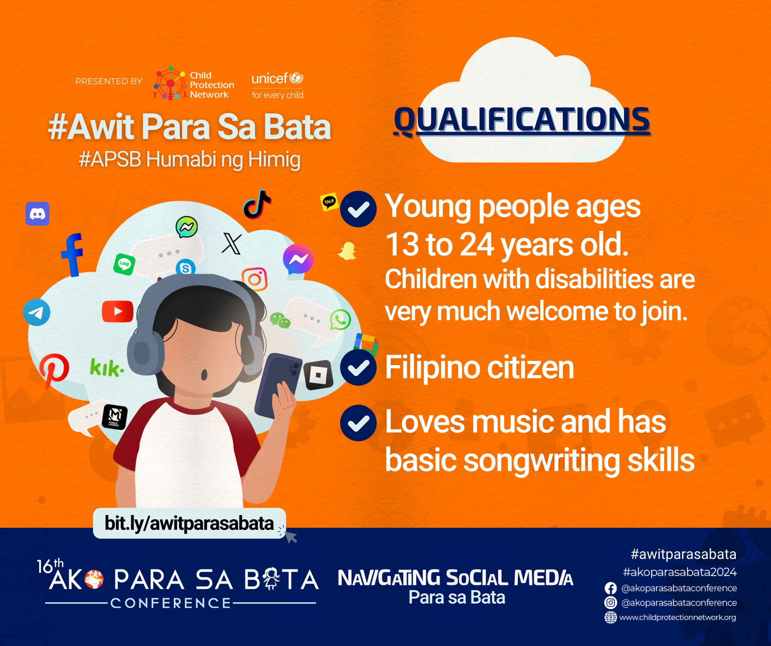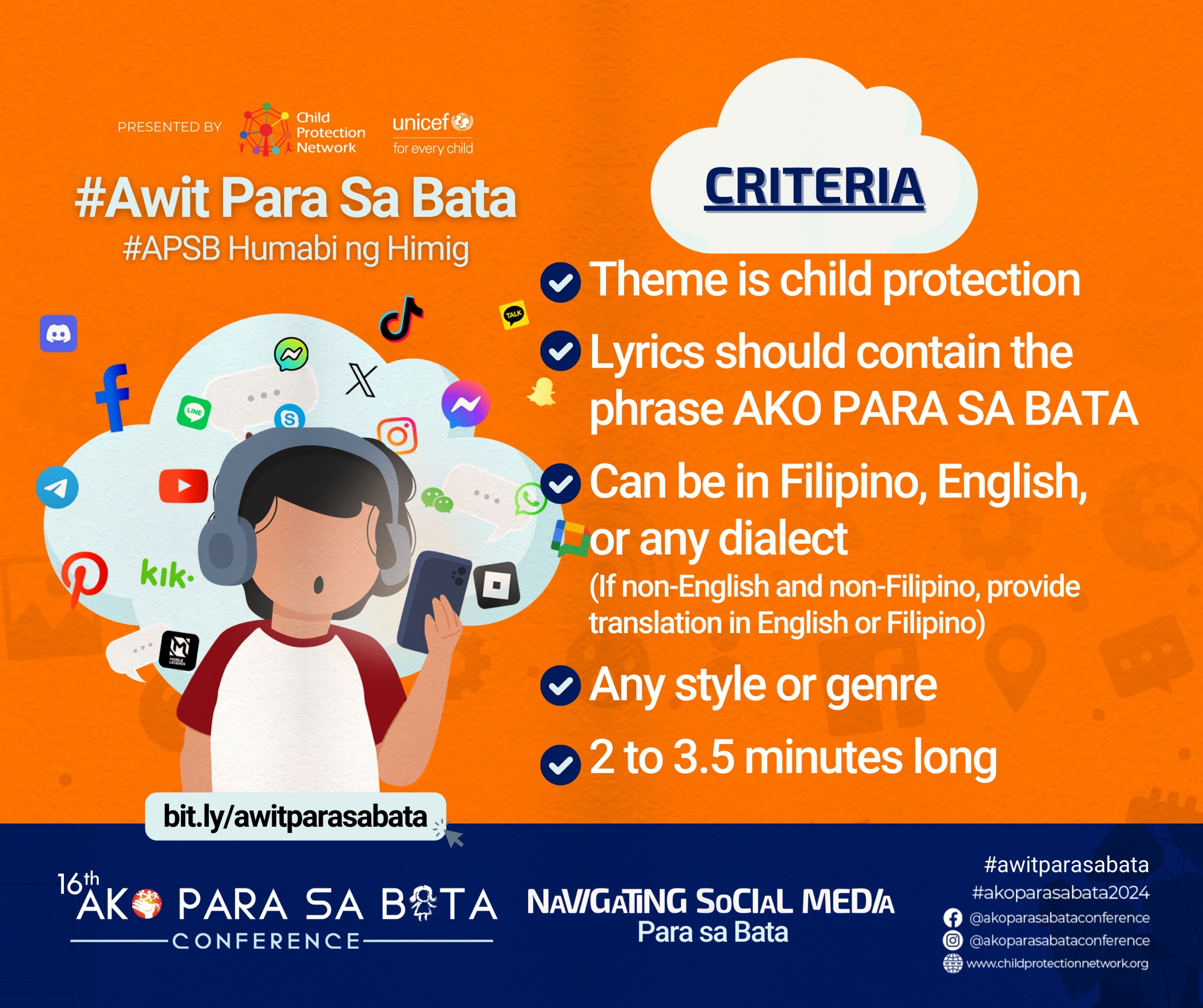 In line with the 16th AKO PARA SA BATA (I am for the Child) Conference, the Child Protection Network Foundation, Inc. and UNICEF Philippines is looking for the official song of the AKO PARA SA BATA Conference.