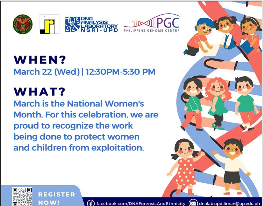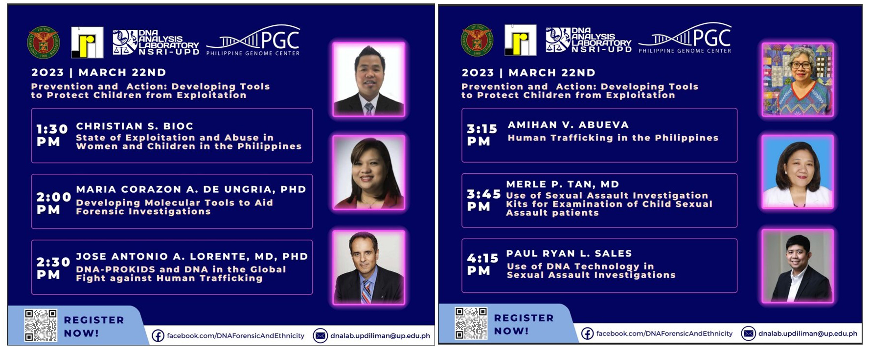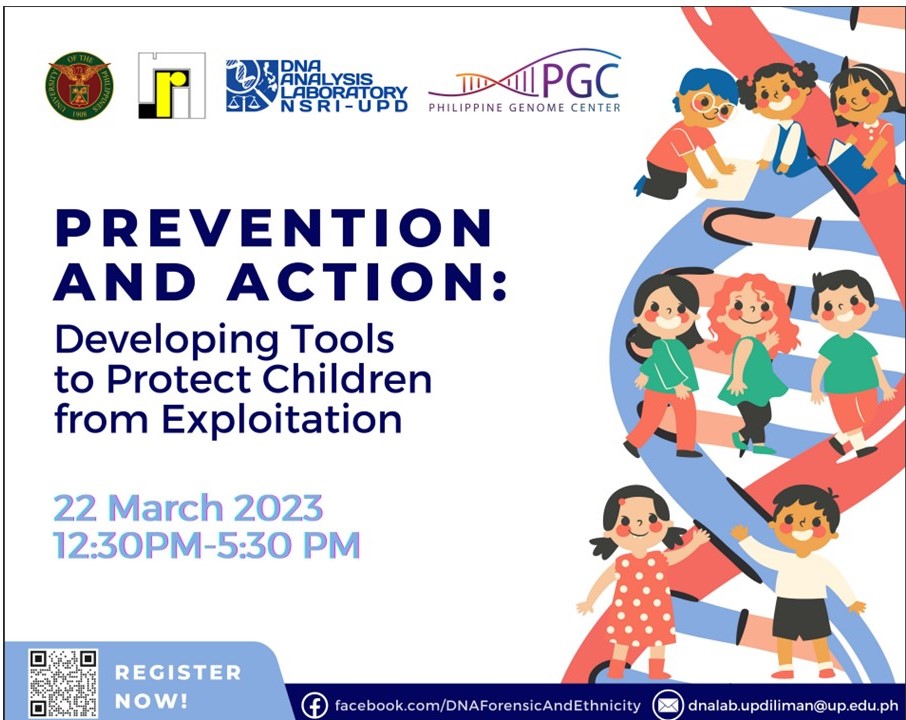 The DNA Analysis Laboratory of NSRI UP Diliman is hosting the webinar, “Prevention and Action: Developing Tools to Protect Children from Exploitation” on March 22, 2023, at 12:30 pm.